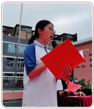 九年级林可晗同学作为入团积极分子代表发言。她说:“每一位少先队员心中都有着共同的信念——听党话,跟党走,时刻准备着,为共产主义事业而奋斗。我们是新生的曙光,是初升的太阳,身上流淌着汩汩热血,在新征程上,我们要奋进有为,早立志,立长志,立大志,聆听时代召唤,赓续红色血脉,向革命先烈学习,领悟他们的坚韧、执着、勇毅。我们作为光荣的少先队员,要在党的领导下,怀着一颗赤子之心,坚定信念,为中华民族伟大复兴而奋斗。”